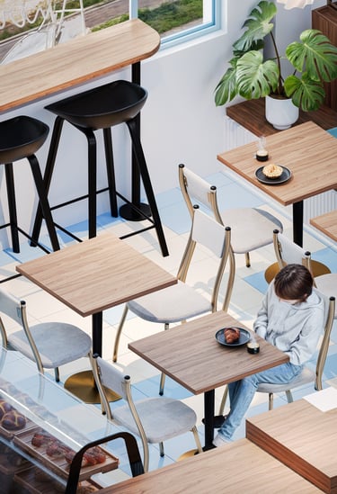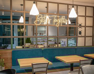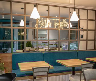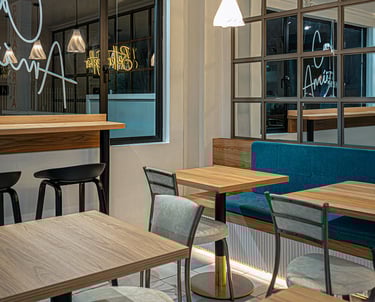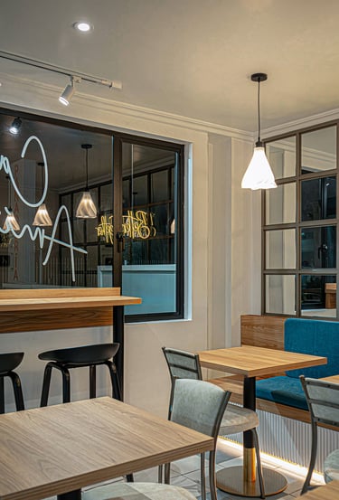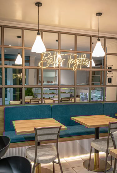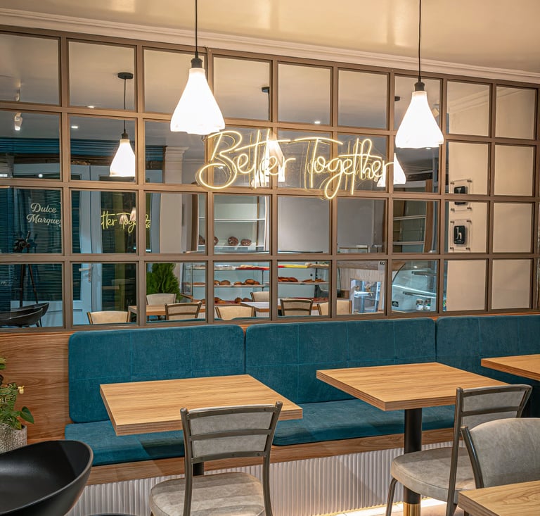 Remodelación interior de un espacio mixto de panadería y cafetería generando un ambiente cómodo y relajante.
